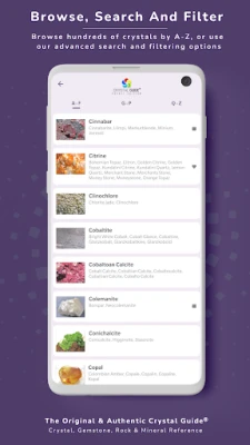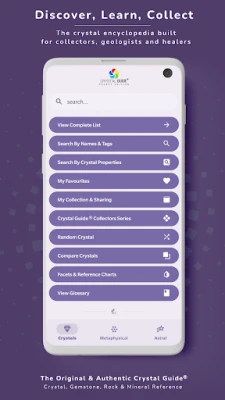 Med Crystal Guide® Pocket Edition er det nemt at udforske. Gennemse det omfattende A-Z-indeks, søg efter specifikke navne, eller anvend avancerede filtre til at opdage den perfekte mineral. Hver post beriges med betagende billeder og dybdegående information, der dækker alt fra geologiske fakta, fysiske egenskaber, sjældenhed og findesteder til stenens metafysiske aspekter. Lær om chakraforbindelser, numerologi, stjernetegn og planetariske associationer samt detaljerede råd om healing og eliksirer. Denne dybde sikrer, at du altid finder præcis den information, du søger.