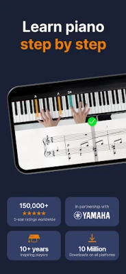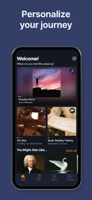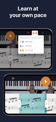 Uanset om du er helt nybegynder eller en garvet pianist, tilbyder flowkey en struktureret og engagerende læringsvej. Nybegyndere guides trin for trin gennem grundlæggende principper som nodekendskab, navigering på klaviaturet og at spille med begge hænder. Erfarne spillere kan finpudse deres færdigheder med dybdegående øvelser i skalaer, akkorder og improvisation. Den interaktive træningsoplevelse er kernen i flowkey: Brug 'Wait Mode', som venter på dig, indtil du rammer de korrekte toner, øv hænderne separat, gentag specifikke sektioner med 'Loop'-funktionen, og få visuel vejledning fra professionelle pianister. Selv traditionelle noder er tilgængelige for tabletbrugere i portrættilstand. Alt, hvad du behøver, er din enhed (telefon, tablet eller laptop) og et akustisk klaver, digitalklaver eller keyboard.