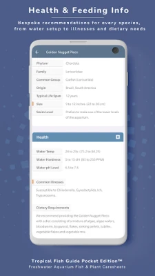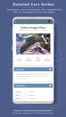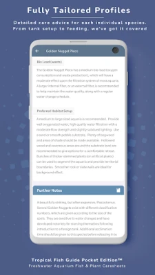 Udforsk hundredvis af detaljerede profiler, der spænder over et enormt A-Z-register af ferskvandsakvariefisk og -planter. Hver profil er beriget med unikke billeder og skræddersyede data, understøttet af et søgbart indeks, der omfatter over 2000 almindelige og videnskabelige navne. Anvend avancerede søgefiltre til at identificere arter baseret på størrelse, miljøkrav, temperament eller kompatibilitet, og find den perfekte match til dit akvarium. Få adgang til artspecifikke anbefalinger for indretning, belysning, filtrering, vandparametre og kost. Deltag i aktive diskussionsfora, hvor du kan stille spørgsmål, anmode om identifikationer og udveksle erfaringer med et fællesskab af ligesindede entusiaster.